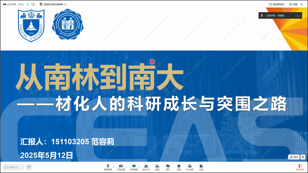 范容莉以“从南林到南大,每一步都算数”为主题,结合个人成长路径,直观展示了材化人的科研成长与突围之路。作为首批入选中国科协青年人才托举工程博士生专项计划的在读博士,她从“专业课学习”“大学生创新训练项目”“毕业设计”“专业技能提升”四个方面,生动阐释了从被动学习到主动探索、从孜孜以求到久久为功的获得感、幸福感和责任感。“积极参与科研项目”“注重团队合作与交流”“保持健康的生活方式”……面对学业、科研和生活的三重追求,她用向阳生长的信念、初心如磐的坚守、顽强拼搏的毅力,一步一个脚印,走出了属于自己的电催化科研之路。