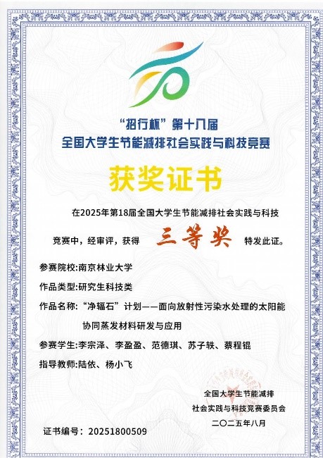 近日,“招行杯”第十八届全国大学生节能减排社会实践与科技竞赛获奖名单正式公布,由我院杨小飞教授和陆依副教授指导的学生团队作品《“净辐石”计划——面向放射性污染水处理的太阳能协同蒸发材料研发与应用》获得三等奖。
