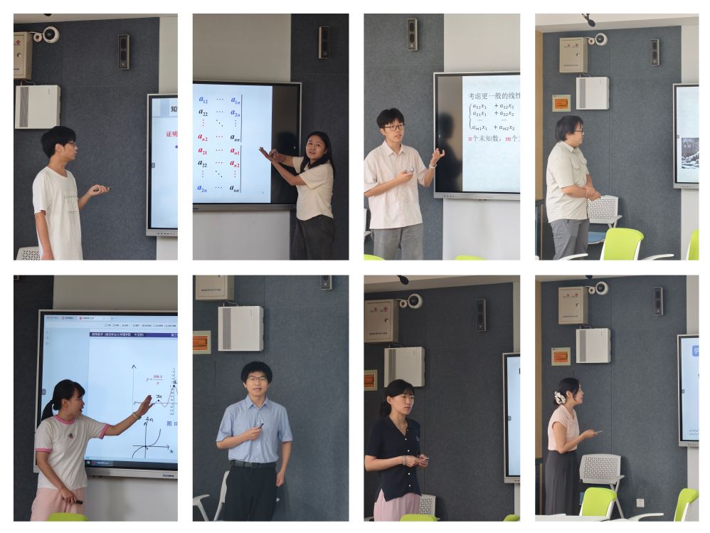 罗振扬教授、雷文教授与徐爱军副教授担任评委。九位青年教师积极参赛,紧密围绕课程内容,以生动的表达、丰富的案例与现代教学手段,深入浅出地解析专业知识,充分展现了扎实的教学功底与创新的教学思维。其中吴凯利老师的《高等数学》从实际应用案例出发,让学生逐步理解了曲率的定义,并通过曲率在高铁上的应用引出课程思政,培养了学生爱国主义情操与民族自豪感;吴藏老师的《环同态的应用—中国剩余定理》以“历史—抽象—应用”三维教学为主线,逻辑顺畅,层层递进,获得了良好的课堂反响。其他各位老师分别从不同的课程角度进行了讲授,均获得不错的课堂效果。近两年新入职的教师也到场观摩学习。