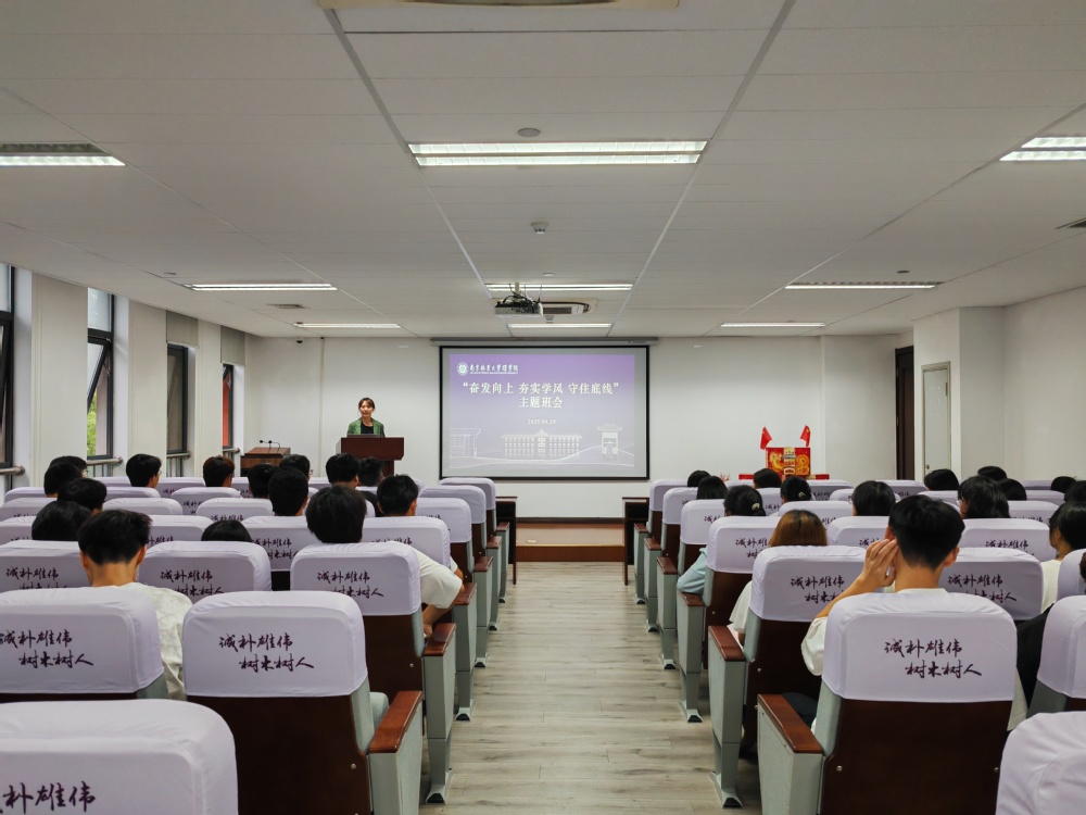 随后,大家来到理学院所在的南山楼4楼,走廊两侧“理院之星”光荣榜与考研竞赛光荣榜迎面而来。吉诗鹭为大家介绍了学院概况和三好评优、发展入党的细则与要求,鼓励同学们以梦为马,勤奋进取,把握好每一次锻炼自我、超越自我的机会,争取成为下一位“理院之星”;刘天仪以班会形式解读《学生违纪处理规定(修订)》,用真实案例划出底线、亮出红线,让“敬畏规则”成为青春起跑的“发令枪”。
