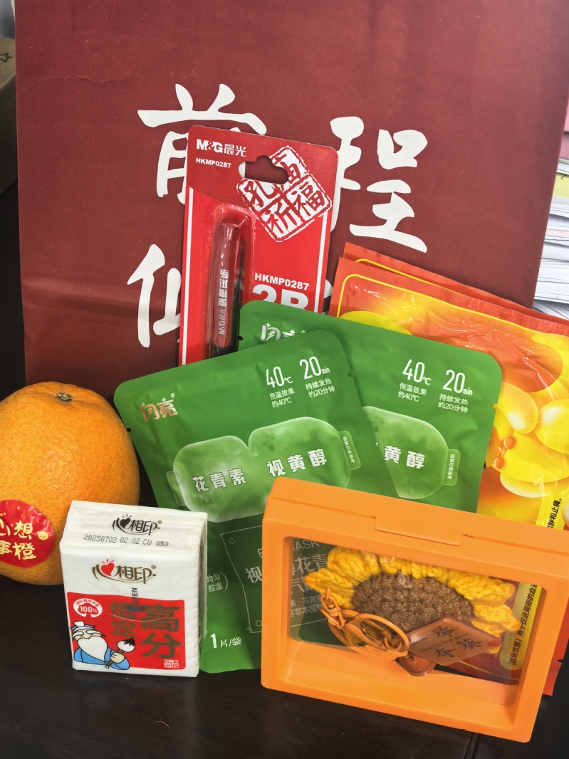 学院为每位考生精心准备的“考研加油包”寓意满满、实用暖心:蒸汽眼罩帮助缓解疲劳,暖宝宝抵御严寒,橙子寓意“心想事成”,涂卡笔助力考场实战,而“一举夺魁”挂件则寄托了对考生“成功上岸”的美好祝愿。每一件物品都凝聚着学院师生对考研学生的深切关怀和良好祝愿。