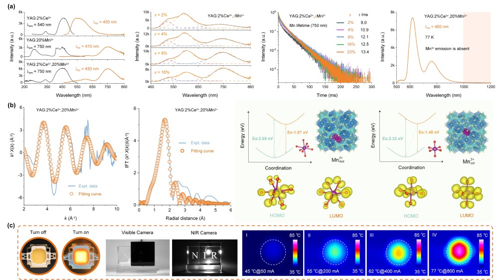 应用物理系研究团队另辟蹊径,利用稀土Ce3+的高效吸收能力及其向过渡金属Mn2+的能量传递,从源头解决了近红外发光材料吸收弱的难题,成功研发出新型高效近红外发光材料。研究通过实验光谱学与理论计算相结合的方式,系统阐明了Mn2+在石榴石结构中的近红外发光机制,为理解其它Mn2+激活材料的近红外发光行为提供了理论支撑,也为新型近红外荧光粉的理性设计奠定了重要基础。Light-Sci Appl. 2025, 14, 194; https://doi.org/10.1038/s41377-025-01816-y